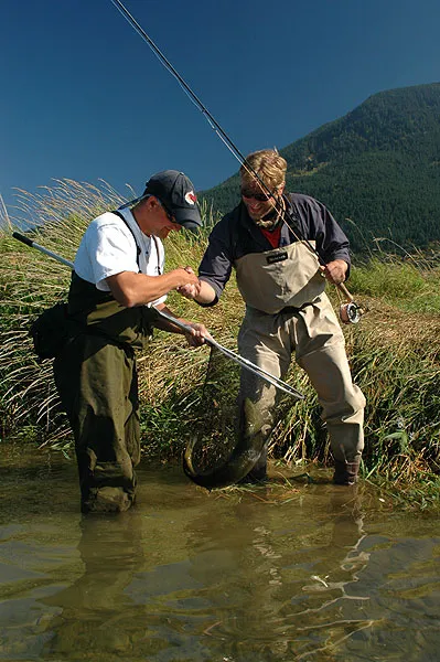 Erik and Ole shake hands after the successful landing of a large coho in the Harrison River.