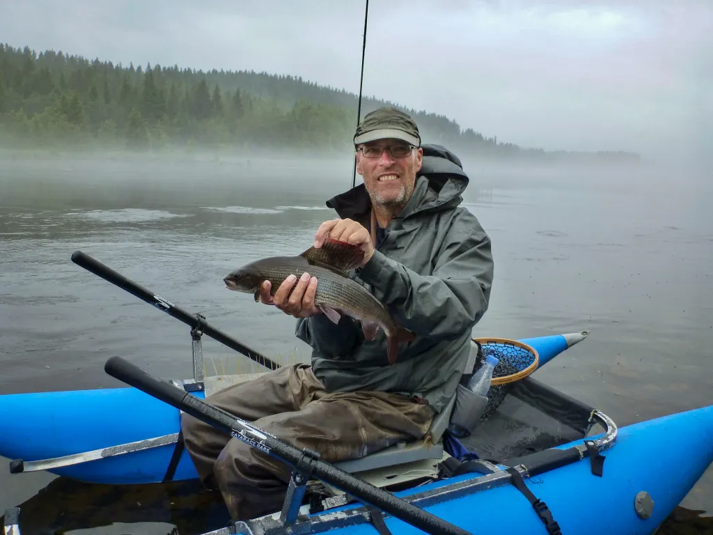 Henrik Leth in his pontoon boat with beautiful grayling from 2014.