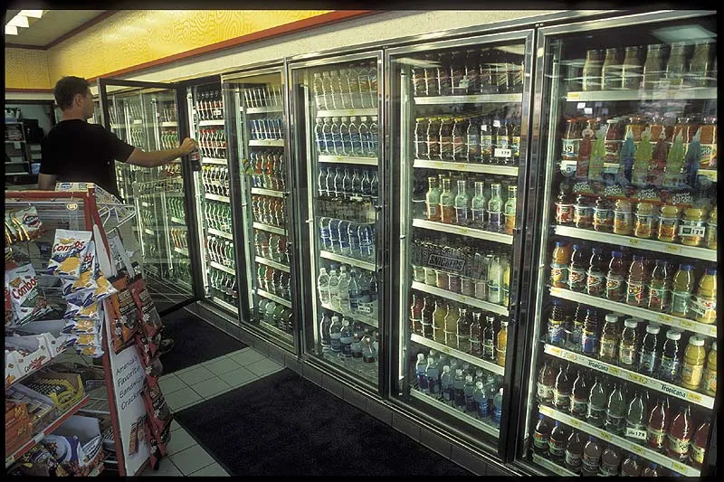 This is so typical that Americans do not even notice. The selection of everything is so vast, that choosing is a problem. This is just the soft drinks section at a plain, local gas tank.