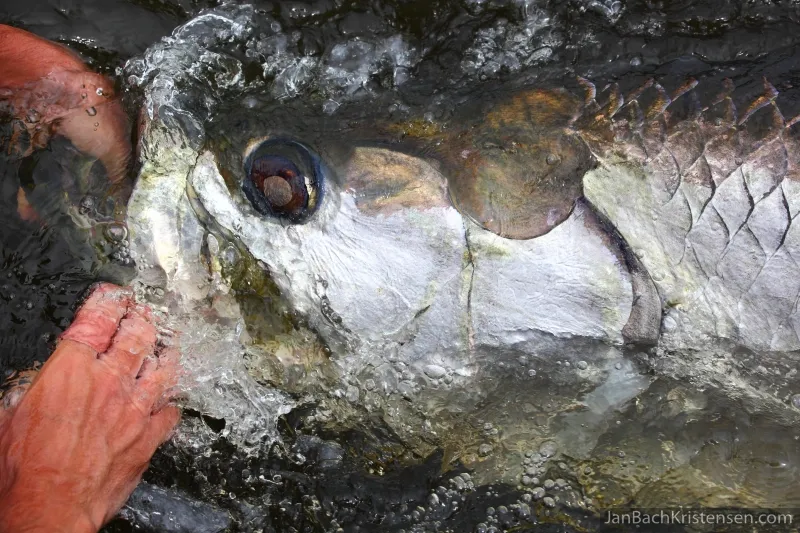 Everything is large on on a large tarpon: mouth, eyes, gill plates, scales...