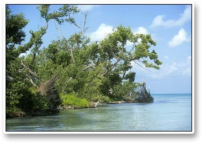 The edge of a small idyllic island close to the tarpon flats. This is very typical: the trees grow on the beach and all the way into the water, leaving almost no terra firma for a poor fisherman. Most of these islands would be muddy, waterlogged and impossible to stand or walk on.