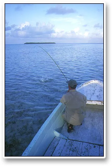 Kneeling down to prepare for landing a bonefish that has taken its runs. The last minute these fish are tired, and only able to seek to the bottom in the shallow water.
