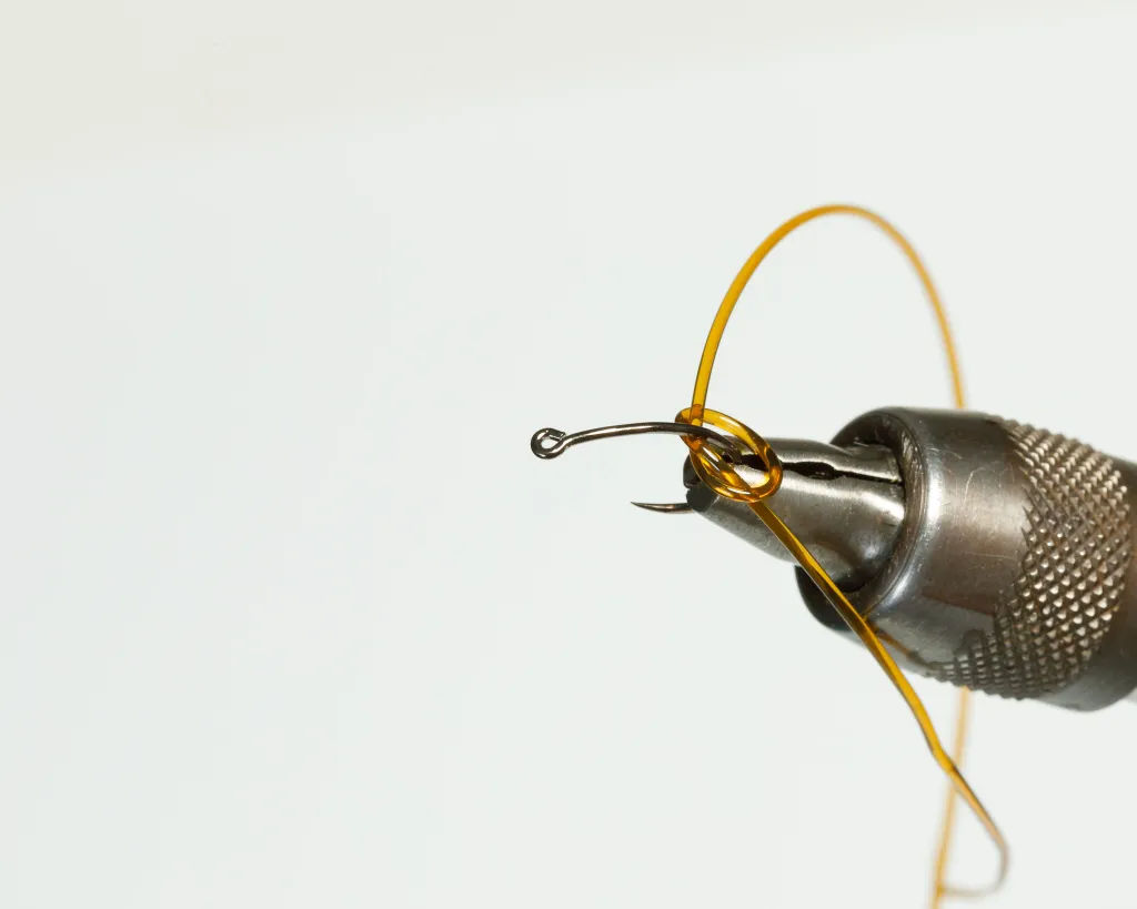 Tie an overhand knot around the hook with the ends underneath.