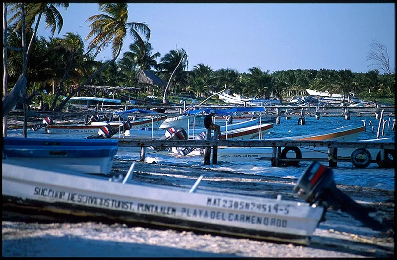 The beach in front of Punta Allen is littered with boats.
