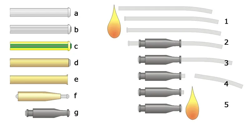 At the left different types of tubes and liner: a) unlined, b) plastic with linier, c) colored plastic with colored liner, d) lined brass, e) polished brass, f) rear tube with liner/inner tube and g) a bottle with liner. To the right the process of lining: 1) burn a rear collar, 2) mount the liner, 3) pull tight, 4) trim and 5) burn a front collar.