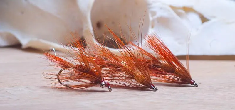 Ken Bonde Larsen who tied these Omoe Brushes is an avid hunter, and one of his deer skulls made a perfect backdrop for the fly shot. The flies were gently stuck in the table and lit with a small softbox.