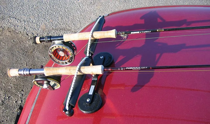 The Tightline Enterprises rod holder will stick tightly to any metal hood. The bungee-and-ball system, which can be seen clearly here will hold several rods with no efforts. Three rods on each side is no job at all.
