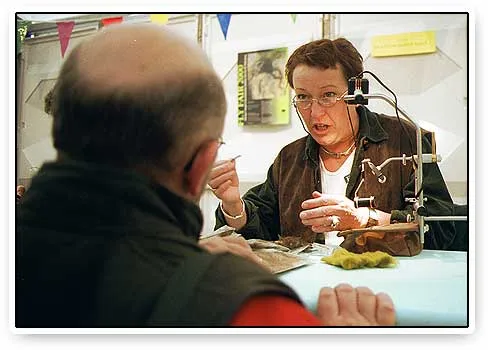 Dutch fly tyer Marijke Roos enthusiastically explaining a tying step to a bystander.