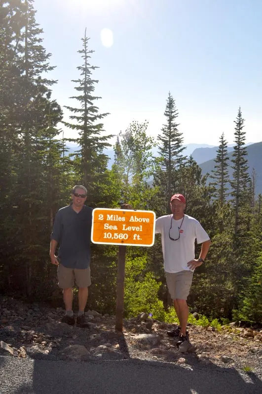 (L to R) Shane Murphy and Wes Wells stand near a road sign in Rocky Mountain National Park. They would soon go another 2,000 feet higher to the top of Trail Ridge road on the way to the other side of the Park.