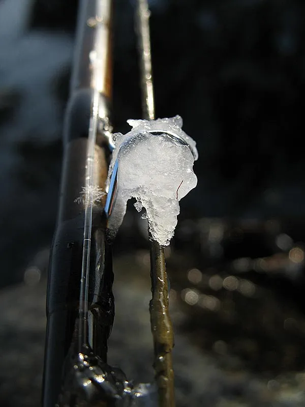 With this much ice in the guides there is nary a chance of getting the line to shoot. You can rinse away, but ice builds up just as quickly again.