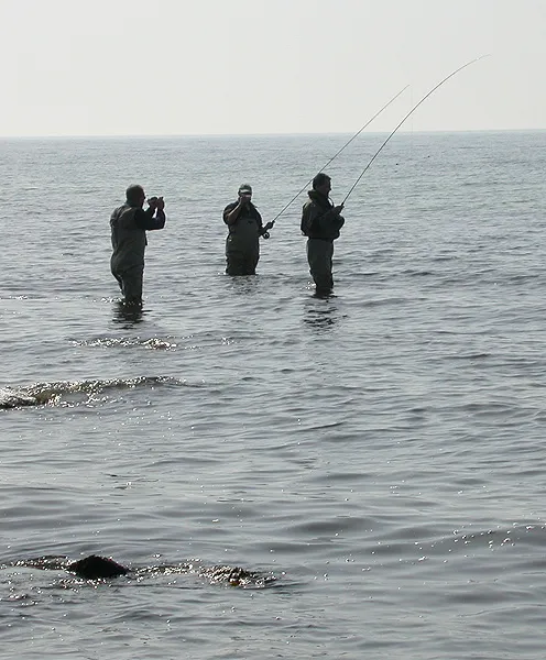 Notice how two fellow anglers approach the lucky one who has a hookup with the cameras out