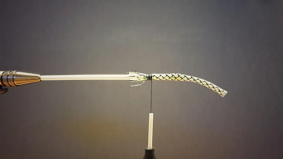 Tie in the Mylar tubing by passing it over the Mirage tinsel and then a bit. Tie it down, letting the tying thread just reach the tinsel (which is under the tube)