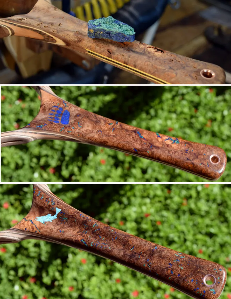 Natural azurite/malachite sitting atop a Carolina cherry burl net handle. Note the numerous burl inclusions the azurite will fill