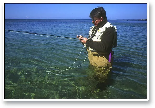 Bart ties on a new fly in tense expectation of another Danish sea trout. Notice the beautiful clearity of the water.
