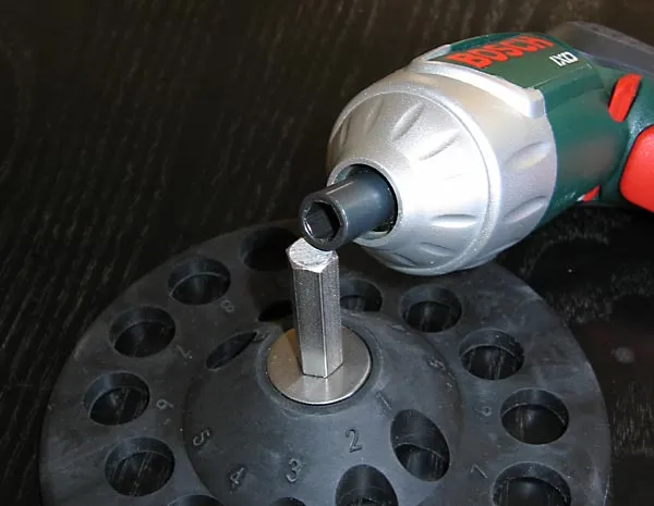 The shaft is unfortunately too large to fit into a standard 1/4" screw bit adapter. It does fit accurately into a No 8 wrench, though.