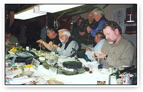 Tying at the NVG banquet. From the left you see: Kim Guilinger (barely visible), Mike Martinek, Chuck Echer, Terry Eggelston (back turned) and Kieran Frye. In the back Bruce Staples is talking to Jan Reniers.