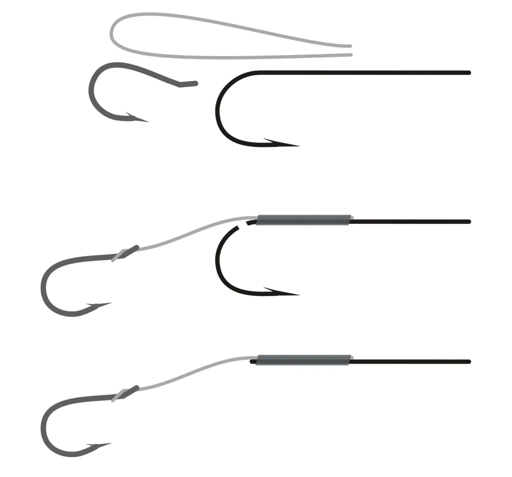 Tying on the wire and mounting the trailing hook. The main hook bend and tip is cut off when the fly has been tied