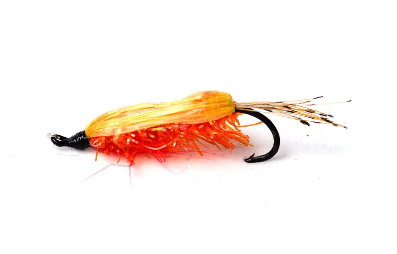 Orange flash chenille, yellow rafia and some GP tippet. Could be an effort to tie a bright shrimp, but I don't remember where the idea came from