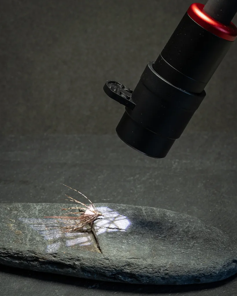 A fly set up for photography with an overhead LED panel and a gobo on the RM 03.