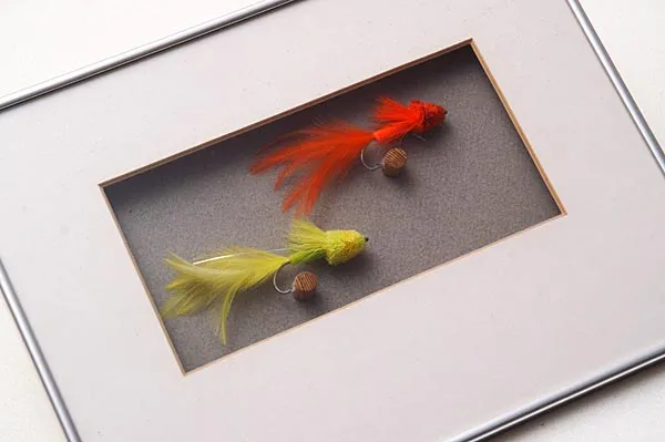 These large flies have been mounted on small pegs made from wooden dowels. Create a small hole in the side of the peg and glue the hook point into it with a bit of hot melt glue.