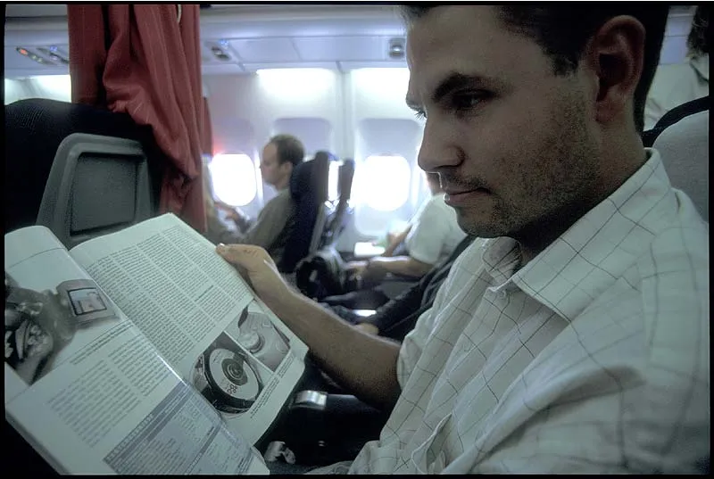Kasper preparing for the purchase of a digital camera while in the US. German photo magazines make good airplane litterature.
