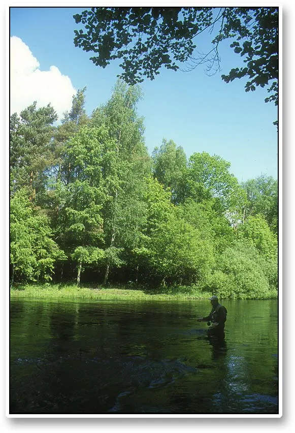 The typical scenery in the upper pools of River Mörrum. The water is mostly calm with some faster parts, and the stream meanders through a beautiful beech forest.