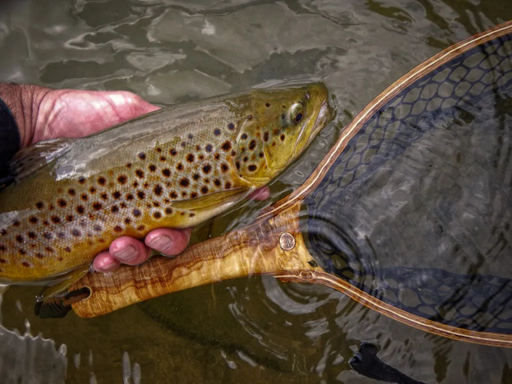 A healthy brown prepped for release above a spalted & curly Maple custom net