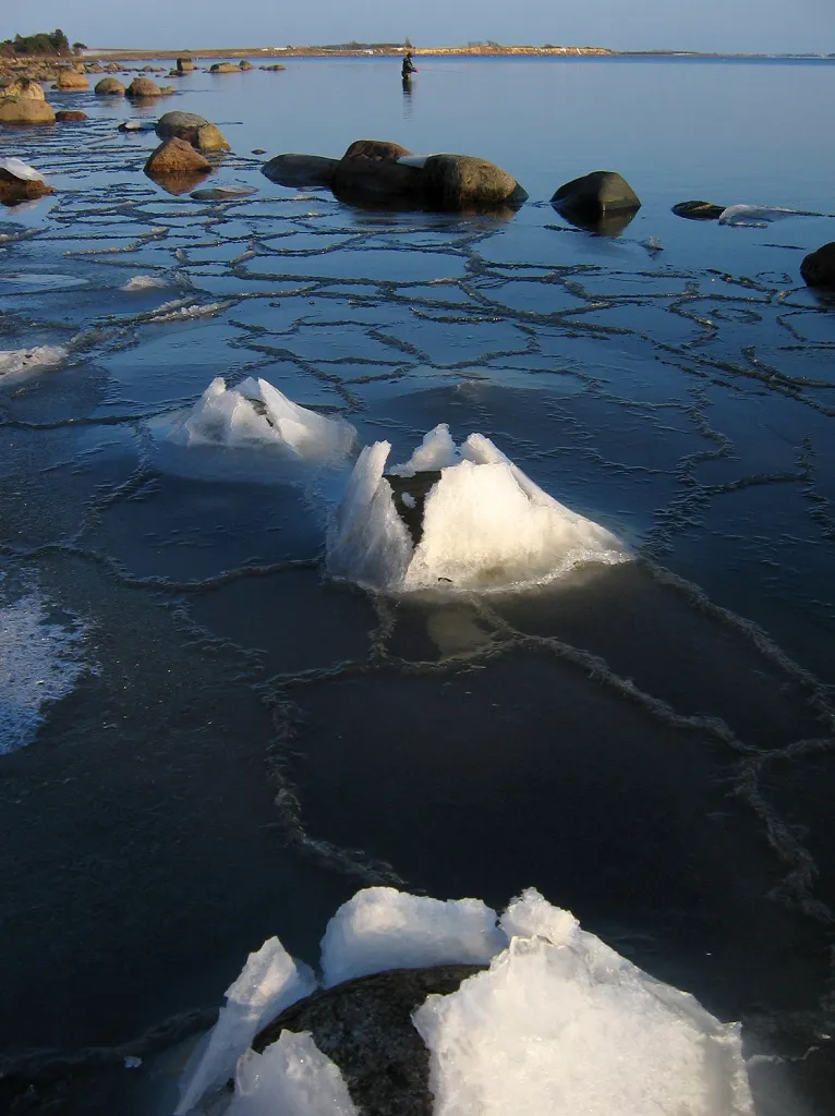 When the tide goes out and the ice covered water sinks, stones may poke through and break the ice cover