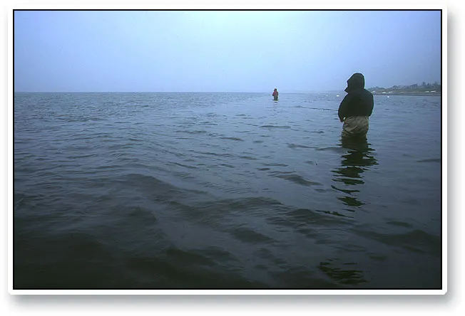 Fishing through the rain again. We had both bright sunshine and heavy rain for our seatrout outings. Notice the clearly visible current seam in front of Tom and Bart. These are always worth a few casts.