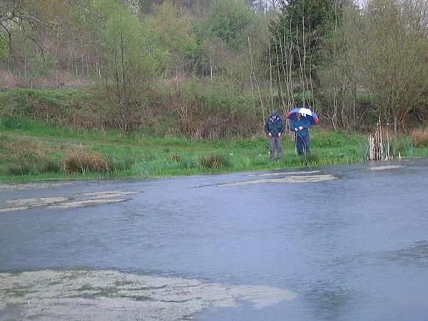 That must be why they are called rain-bows, the fish that Charlie stocks in his secret lake. Notice the umbrella - standard equipment for fishing in Wales.