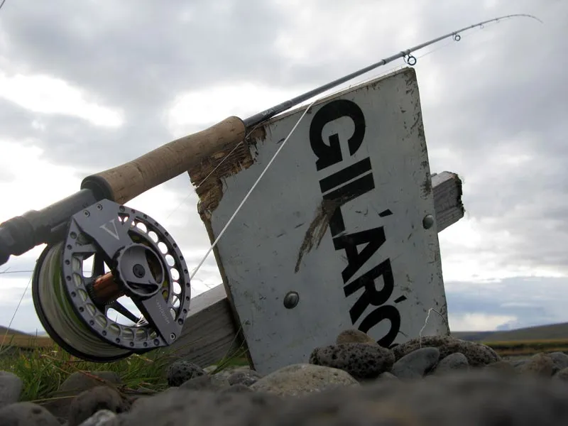 Rod and reel resting on a pool sign by the river