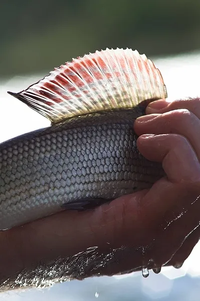 The red and blue translucency of a grayling dorsal fin