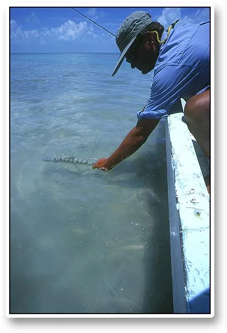 Kim Rasmussen releases a bonefish into the clear water after a tough fight where the fish managed to tangle the leader totally in a mangrove tree, but still stayed on!