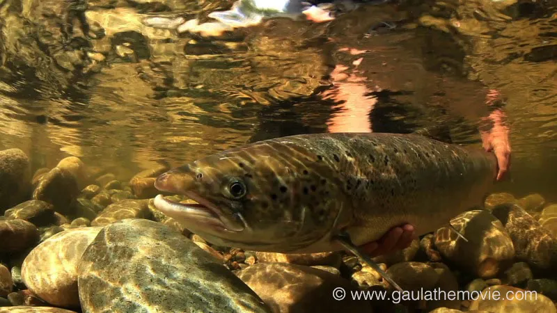 An underwater shot of a salmon release