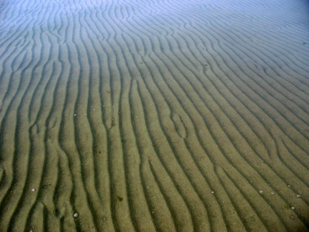 Clear and calm water, ripples in the sand on the bottom.