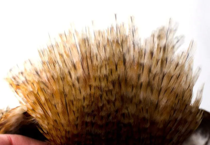 The rooster neck contains the finest and smallest hackle close to the head of the bird, and can deliver some fine and very short barbed, but often short stemmed dry fly hackle feathers