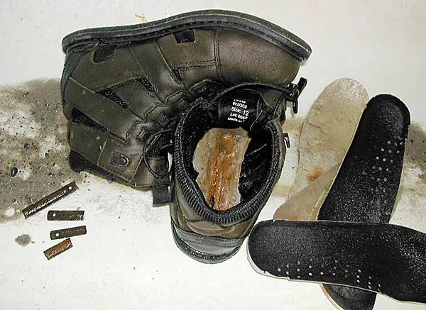 The Chota boots are amongst the most comfortable boots I have owned, but they were not constructed to endure my use. I have worn them in salt and fresh water, always rinsed them when I returned home and kept them as dry as possible. Still they slowly came apart, and as the inner soles and lining started coming off (right), I found the rusty remains of the "steel" inserted into the boot to make them better for hiking (left). Reinforcements like these are great, but they have to be stainless to take the constant soaking that wading boots naturally will meet.