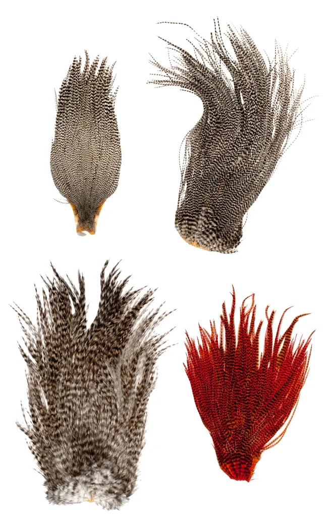 Here you see a grizzly cape (top left) and three different saddles. The cape has short feathers of various sizes while the saddles have long and more uniform feathers. The to top skins are grade 1 dry fly feathers while the two bottom ones are coarser grades, useful for streamers and saltwater flies.