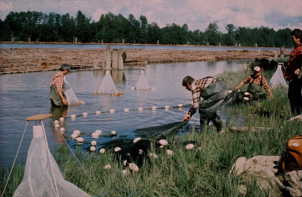 The author (in the red hat) beach seining for young salmon in a research project in the Fraser River estuary, British Columbia. (photo from the author’s collection)