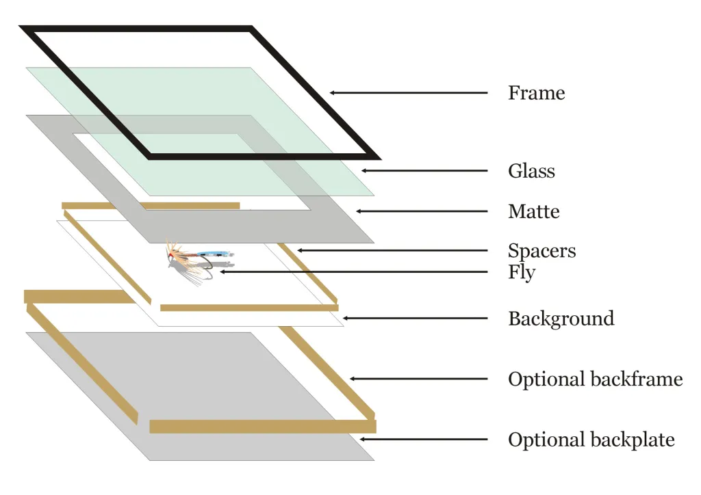The parts of a shadow frame with a fly. The optional backframe and backplate can be added to hide the spacer construction.