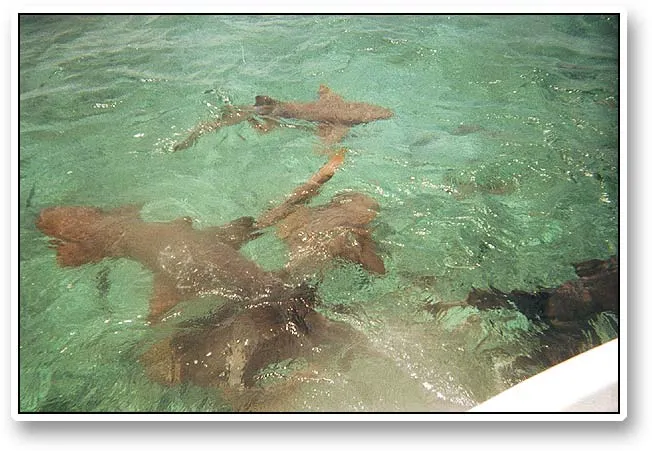 Nurse sharks gather in large numbers if you chum with fish. These mostly harmless sharks are very common on and behind the reef.