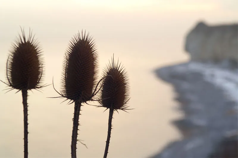 A nice contrast between the morning light on the coast in the background and some dried flowers in the foreground.