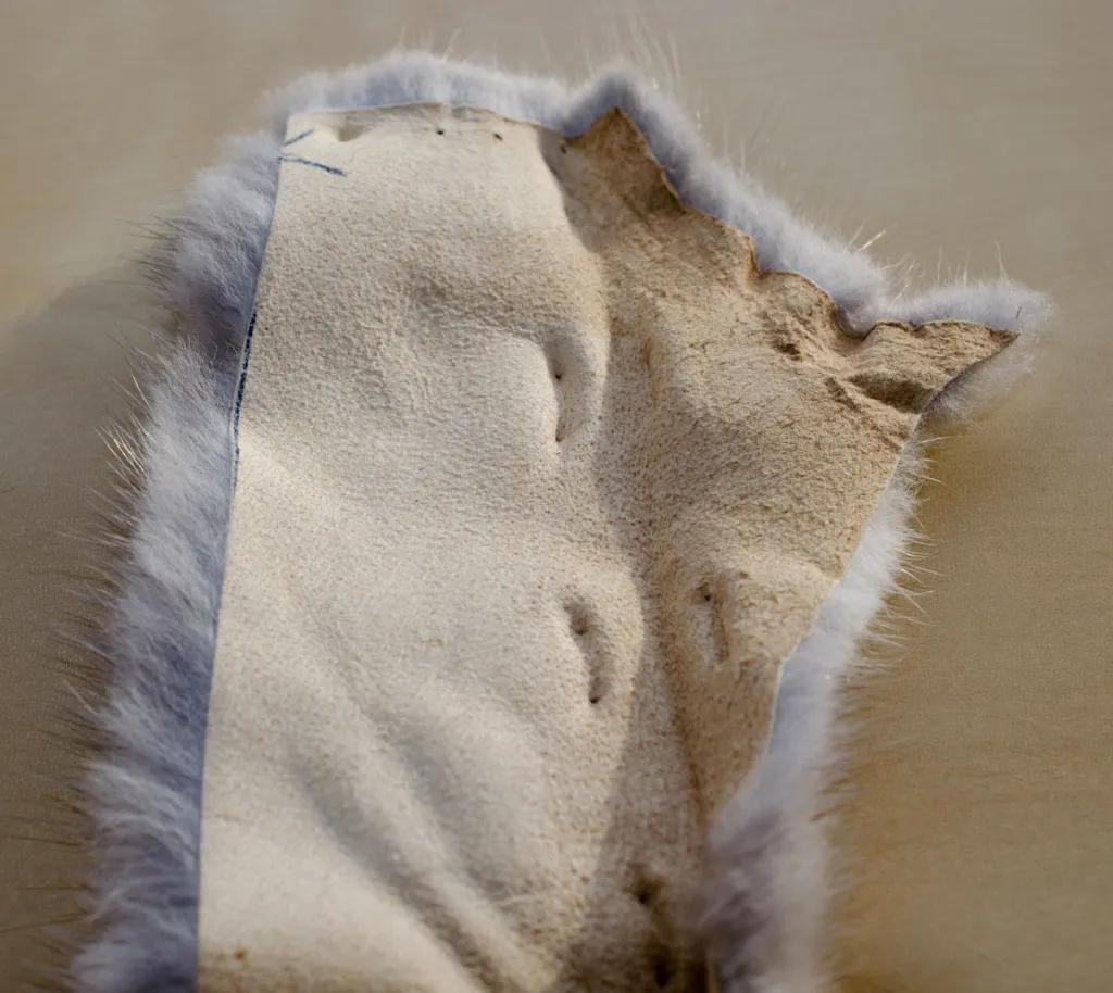 The skin side of this mink strip reveals that it has been stapled for some reason. The hair isn't damaged, but the skin isn't suited for zonker strips.