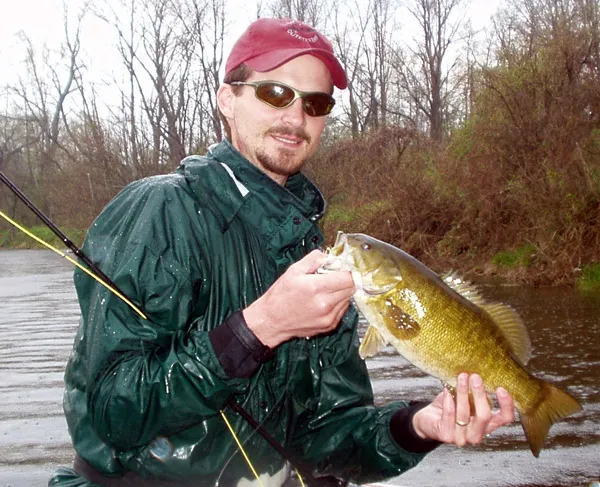 The author with a smallmouth bass that also fell for a two-handed retrieve during a rainstorm