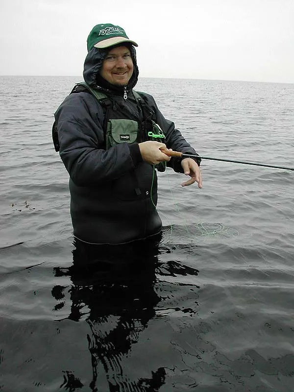 Miserable but happy. Derek strips his fly in an attempt to entice a Danish sea trout