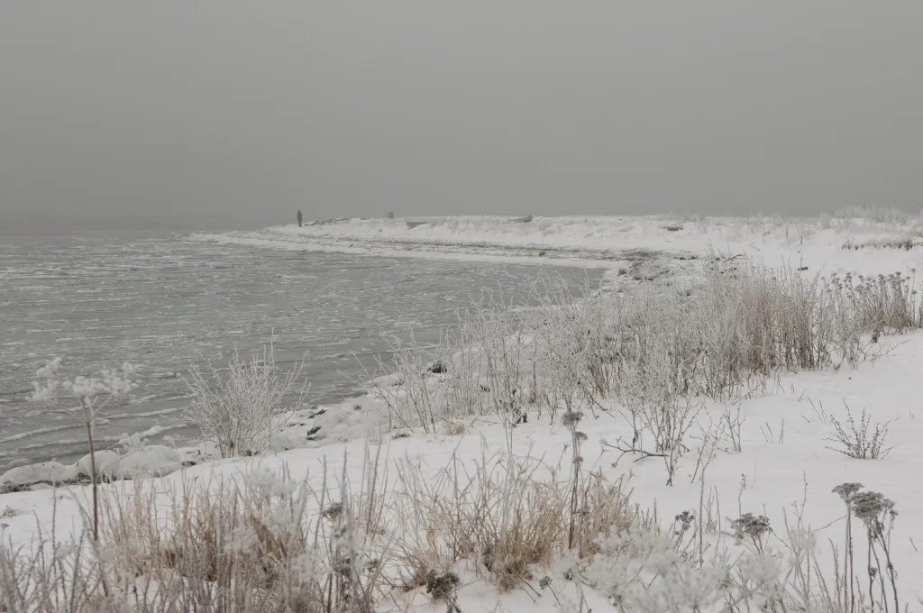 Snow covered coast in the fog