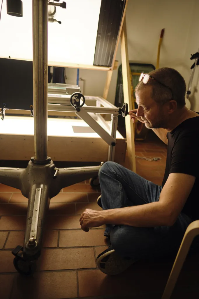 In stead of moving the camera, Søren moves the fish on this custom made rig.