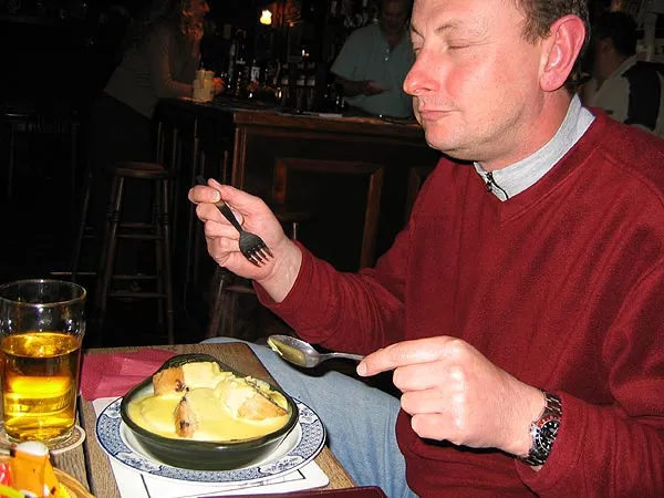 Spotted Dick is the desert, not the person. The person is Paul Slaney obviously enjoying the double serving of this traditional British sweet.