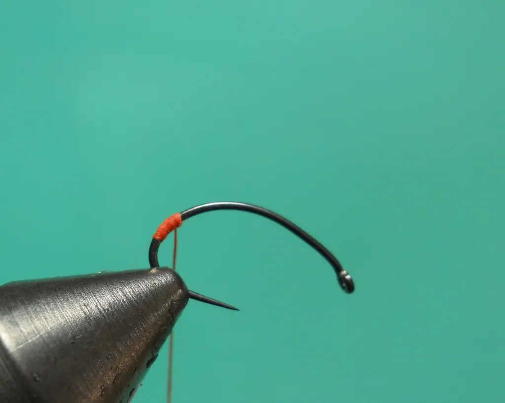 Tie the tag/hotspot in, as far down the bend as possible and start the brown thread on the end of hotspot.