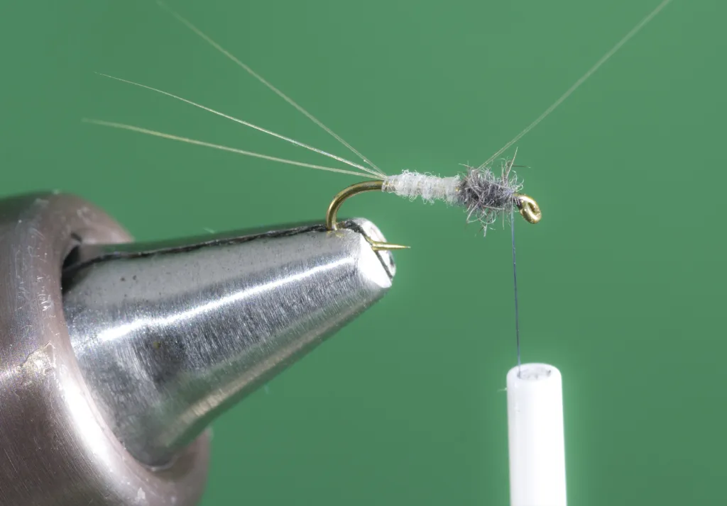 Bend the front microfibbet backwards and make a small thorax with the black dubbing over the fibbet and the front of the fly.